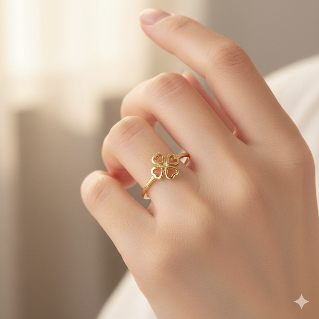 Este anel delicado traz um design encantador em formato de trevo, composto por quatro corações vazados que simbolizam amor, sorte e leveza. Com acabamento polido e banho dourado de alto brilho, é uma peça minimalista e feminina, perfeita para quem aprecia detalhes sutis e cheios de significado.