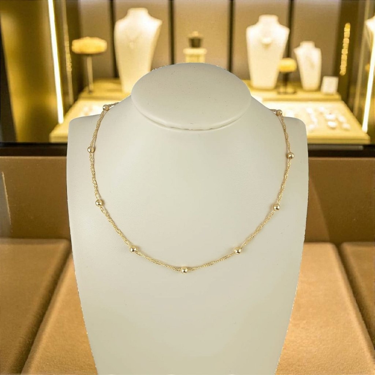 Refinada e atemporal, esta corrente banhada a ouro é o toque perfeito de elegância que transforma qualquer visual. Seu design delicado combina elos trançados com esferas polidas, criando um brilho sofisticado e equilibrado.
