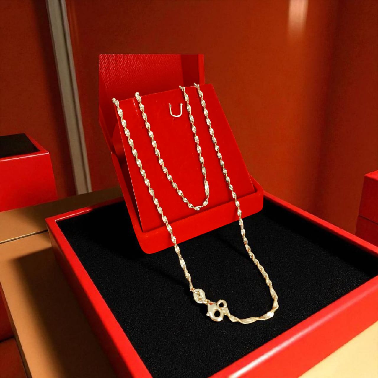 Uma peça essencial para qualquer porta-joias. Esta elegante corrente de elo torcido, banhada a ouro, destaca-se pelo seu design importado que cria um brilho único a cada movimento. Sua textura sofisticada reflete a luz de forma sutil e contínua, sendo a escolha perfeita para ser usada sozinha, realçando a beleza do seu pescoço, ou para dar um toque extra de brilho ao seu pingente favorito. Uma joia versátil, que combina com looks do dia a dia ou para ocasiões especiais.