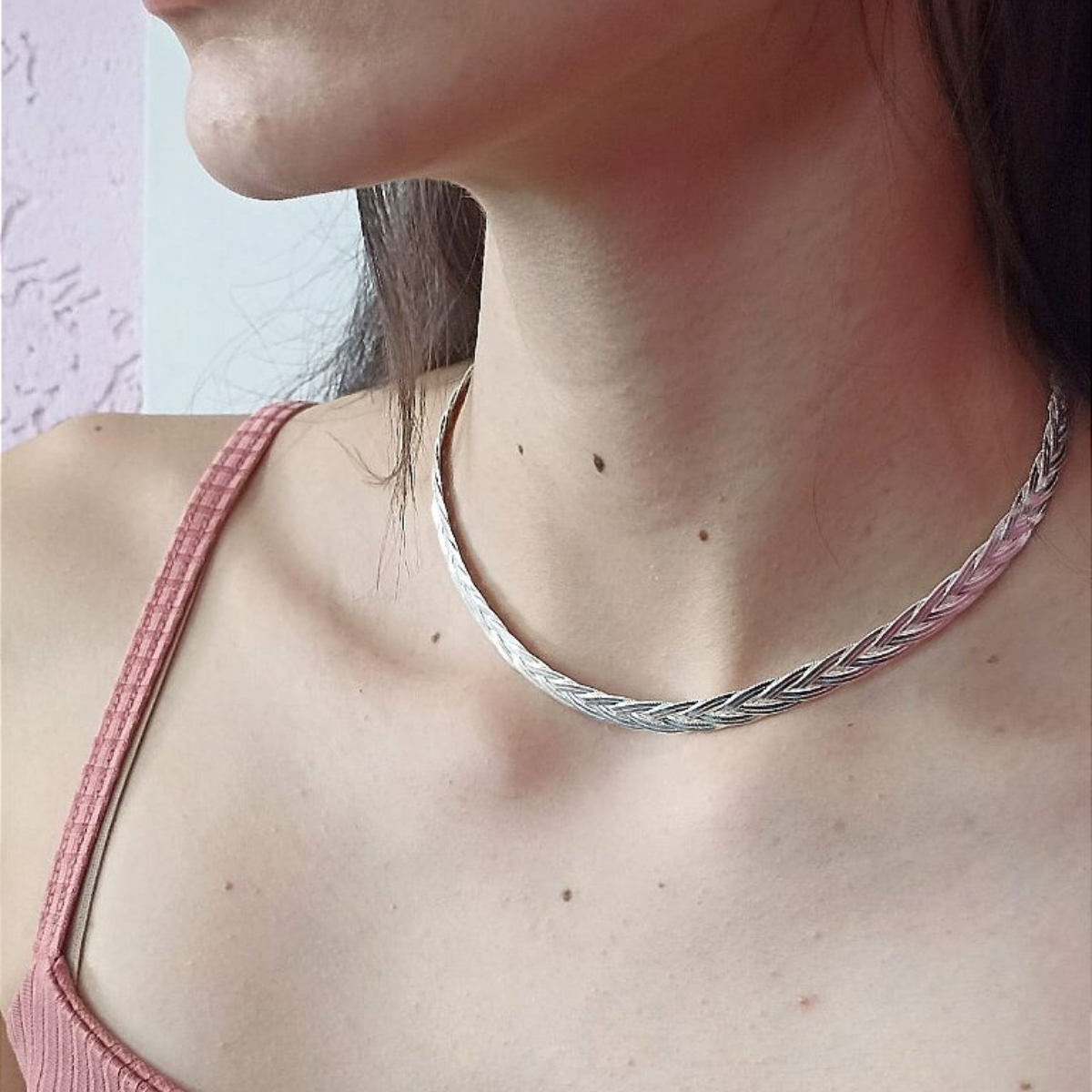 Delicada e ao mesmo tempo marcante, a gargantilha de fios traçados é o acessório perfeito para quem busca um toque de elegância com design diferenciado. Seus fios entrelaçados criam um efeito visual sofisticado, que valoriza o colo e complementa qualquer look com charme e sutileza.