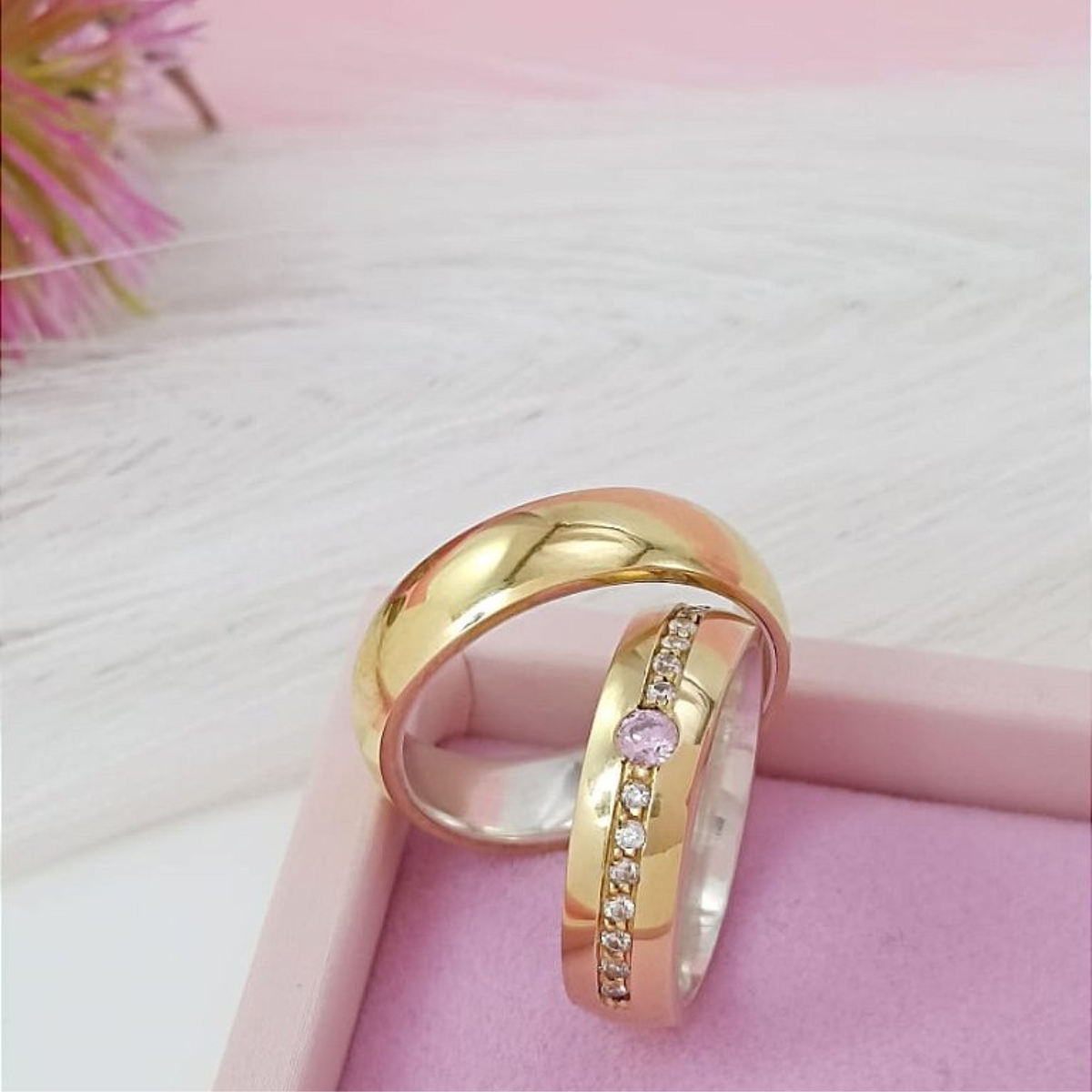 Celebre o amor com este lindo par de alianças confeccionado em moeda antiga. Com acabamento polido e brilho intenso, o modelo combina a elegância do dourado com detalhes marcantes: uma aliança mais larga e lisa, representando a força e união, e outra com fileira de zircônias e uma pedra central rosa, trazendo delicadeza e romantismo à peça.