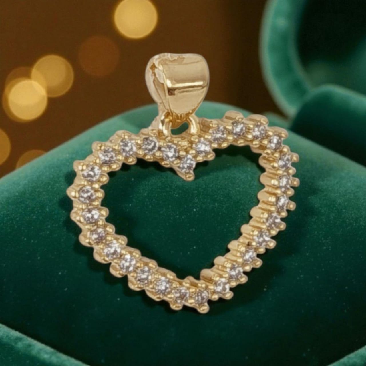 Este pingente de coração vazado é uma explosão de brilho! Delicadamente trabalhado, ele apresenta zircônias cravejadas por toda a sua borda, garantindo um brilho contínuo e intenso. Com um design romântico e moderno, é a joia perfeita para iluminar qualquer visual. Apresentado em um estojo de veludo verde, é ideal para presentear com elegância.