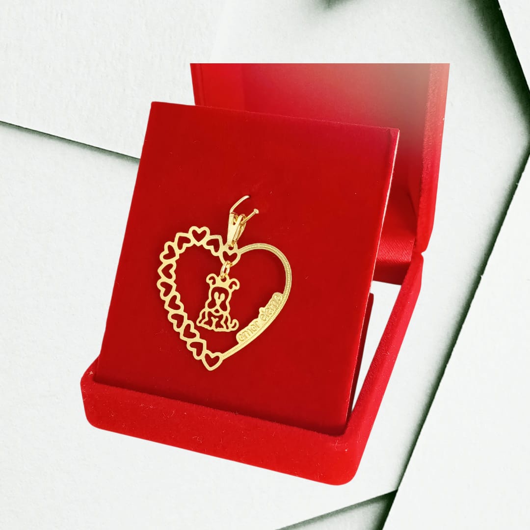 Perfeito para quem ama pets, este pingente traz a combinação ideal entre fofura e significado. O design apresenta um cachorrinho estilizado posicionado dentro de um aro formado por pequenos corações, simbolizando carinho, proteção e o amor incondicional pelos animais.