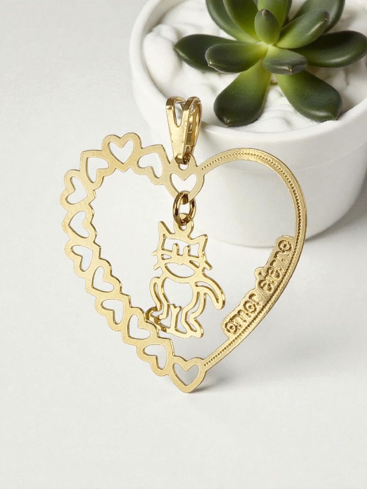 Pingente de coração vazado em tom dourado com a inscrição "amor eterno" e um recorte central de um gatinho. A metade esquerda do coração é decorada com detalhes em formato de pequenos corações.