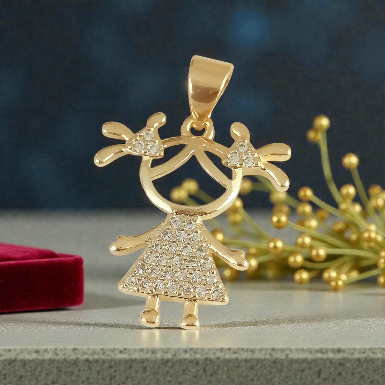 A peça é um pingente dourado que representa uma menina estilizada, com maria-chiquinhas e um vestido. O design é realçado pelo cravejamento de pedras brancas brilhantes (zircônias) que cobrem a saia do vestido e as pontas do cabelo, conferindo um grande destaque e luminosidade à joia