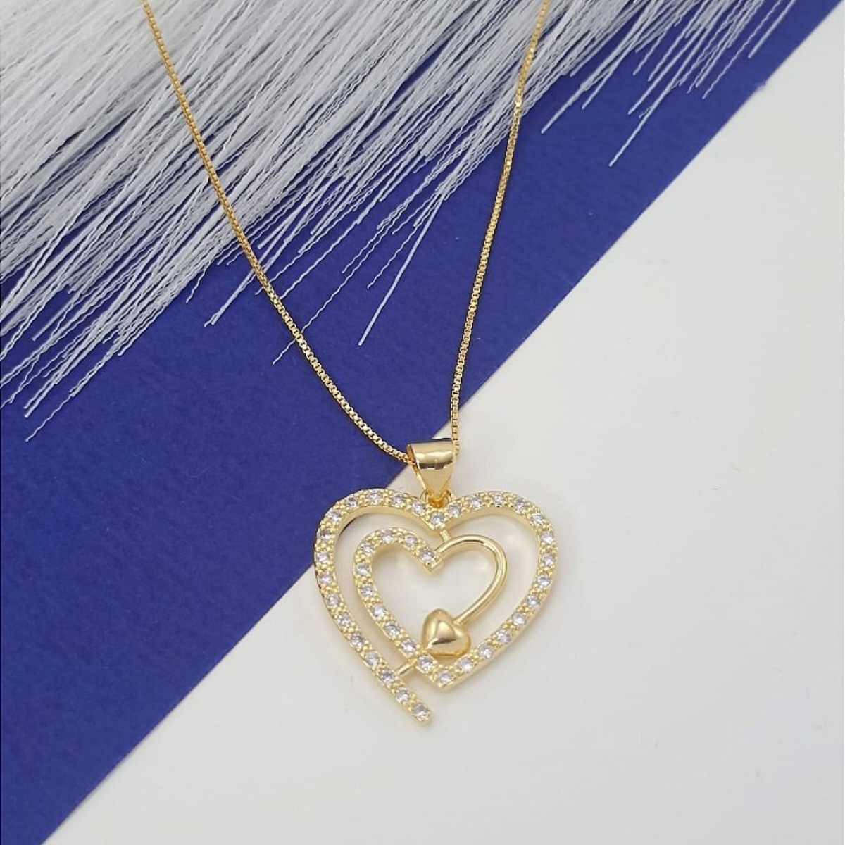 Este elegante pingente banhado a ouro traz dois corações entrelaçados, simbolizando união, afeto e eternidade. O contorno cravejado em zircônias adiciona brilho delicado à peça, enquanto o coração central sólido transmite profundidade e sentimento.