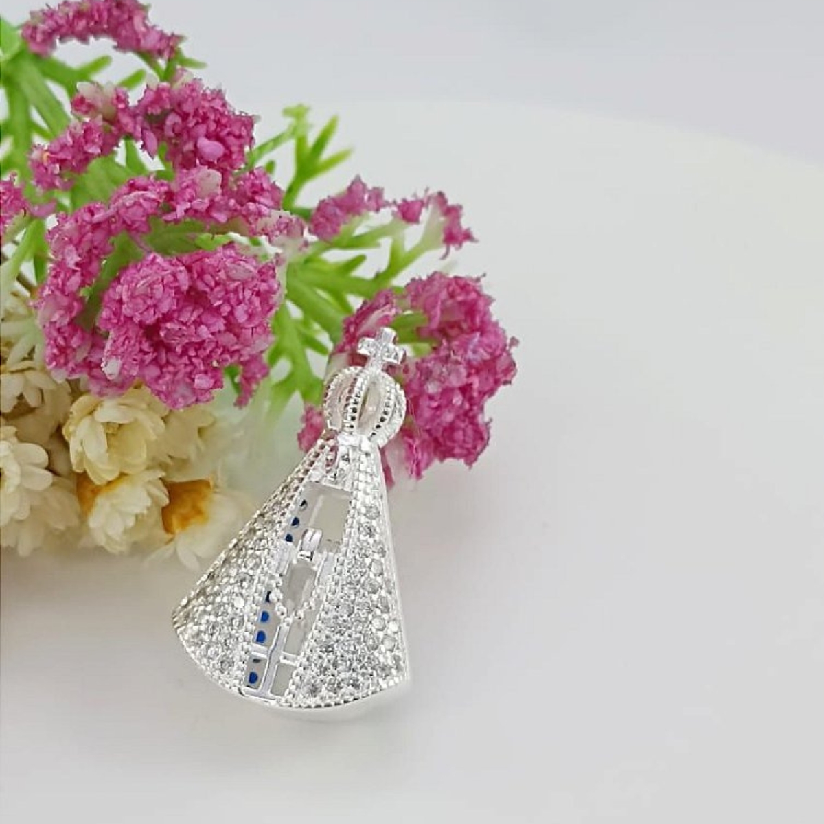 Este lindo pingente de Nossa Senhora Aparecida em formato 3D vazado é uma joia cheia de significado, brilho e elegância. Seu design tridimensional traz a imagem da santa em destaque, com contornos vazados que tornam a peça leve e sofisticada. As mini pedras cravejadas ao redor adicionam um toque de brilho delicado, exaltando ainda mais a beleza e a fé representadas por essa joia.