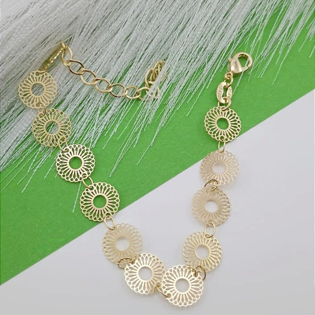 Essa pulseira banhada a ouro é composta por delicados discos vazados com design floral e acabamento brilhante, trazendo leveza e sofisticação para o visual. Uma peça versátil e cheia de personalidade, ideal para quem busca elegância em cada detalhe. Possui extensor ajustável, garantindo conforto e adaptabilidade ao pulso.